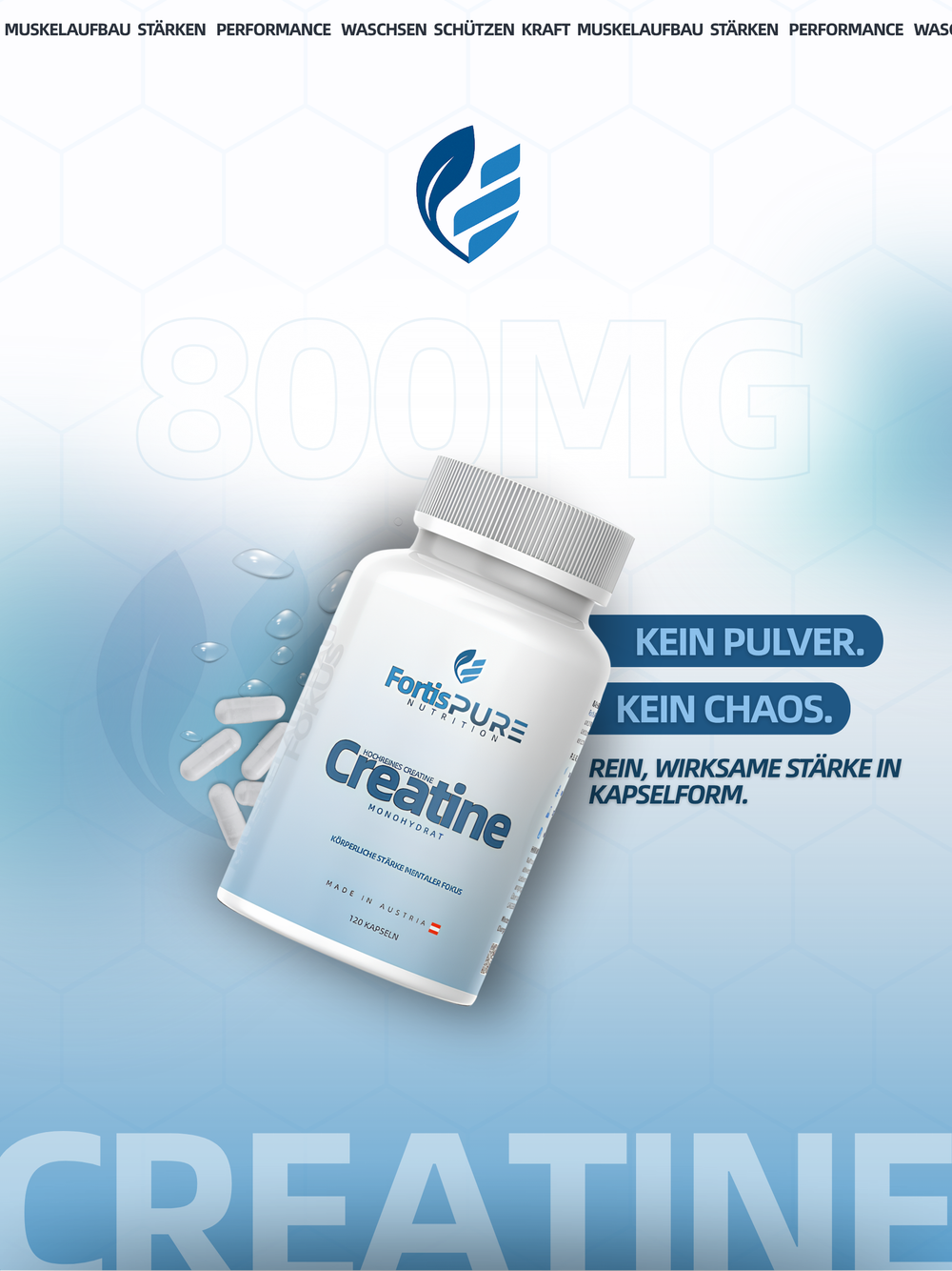 FortisPURE Creatine + EAA die smarte Energie- und Proteinquelle in Kapselform mit reinem Creatine-Monohydrat und alle 8 essenziellen Aminosäuren im optimalen Verhältnis – für maximale Leistungsfähigkeit, Muskelschutz und eine reibungslose Aufnahme, ohne deine Verdauungs- oder Entgiftungsorgane unnötig zu belasten. Jede Dosis liefert hochreines Creatine für mehr Kraft und mentale Power sowie Aminosäuren in freier Form, die dein Körper sofort verwerten kann – vergleichbar mit ca. 15 g hochwertigem Protein. Die ideale Basis für Muskelaufbau, gesunde Gewebestärkung, Knochenaufbau und verbesserte Regeneration.