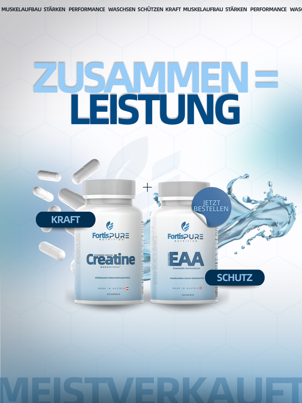 EAA + Creatine sind das perfekte Duo für ambitionierte Sportler und gesundheitsbewusste Menschen. Sie liefern Energie, Schutz und Aufbaukraft – und unterstützen dich dabei, dein volles Potenzial im Training und Alltag auszuschöpfen.